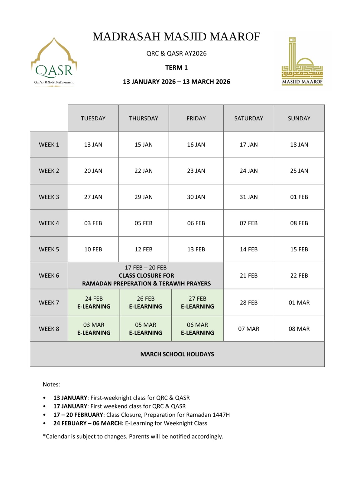- 04 MAR – 06 APRIL: Ramadan closure for Weeknight Class